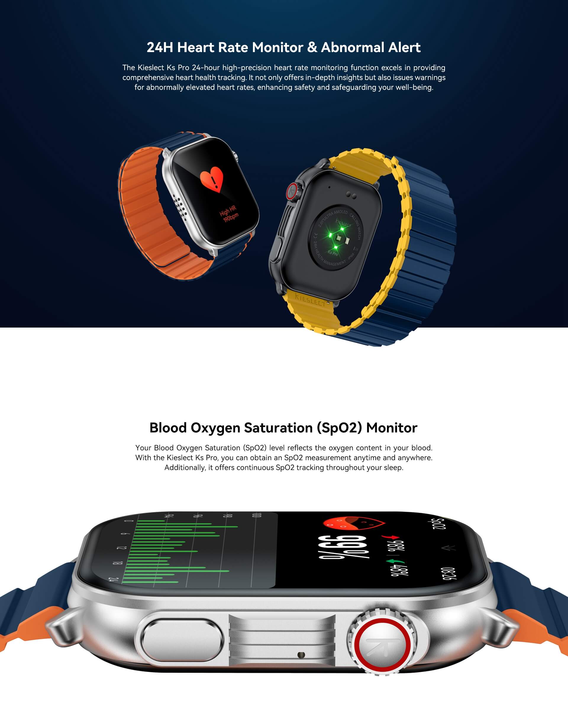 ساعت هوشمند KIESLECT Ks Pro مجهز به عملکرد نظارت دقیق ضربان قلب است که بر سلامت قلب و عروق تمرکز دارد. یک آستانه ضربان قلب شخصی تنظیم کنید، از این طریق Ks Pro به موقع به شما یادآوری می کند که وضعیت غیرعادی را برای شما تشخیص داده است تا اقدامات پیشگیرانه را برای کاهش خطر عوارض احتمالی مانند فیبریلاسیون دهلیزی انجام دهید.سنسورهای ردیابی ۲۴ ساعته ضربان قلب، سنجش سطح اکسیژن خون و تمرین تنفس از حسگرهای مهم قرار داده شده برای این محصول به شمار میروند. سنسور ۲۴ ساعته ضربان قلب در صورت بروز ایراد یا مشکل سریعا اطلاع رسانی میکند. این ساعت هوشمند از بیش از ۱۰۰ حالت ورزشی مانند تنیس، شنا، بسکتبال، دوچرخه سواری و غیره پشتیبانی میکند و میتواند همراه خوبی برای پیگیری فعالیتهای ورزشیتان باشد.